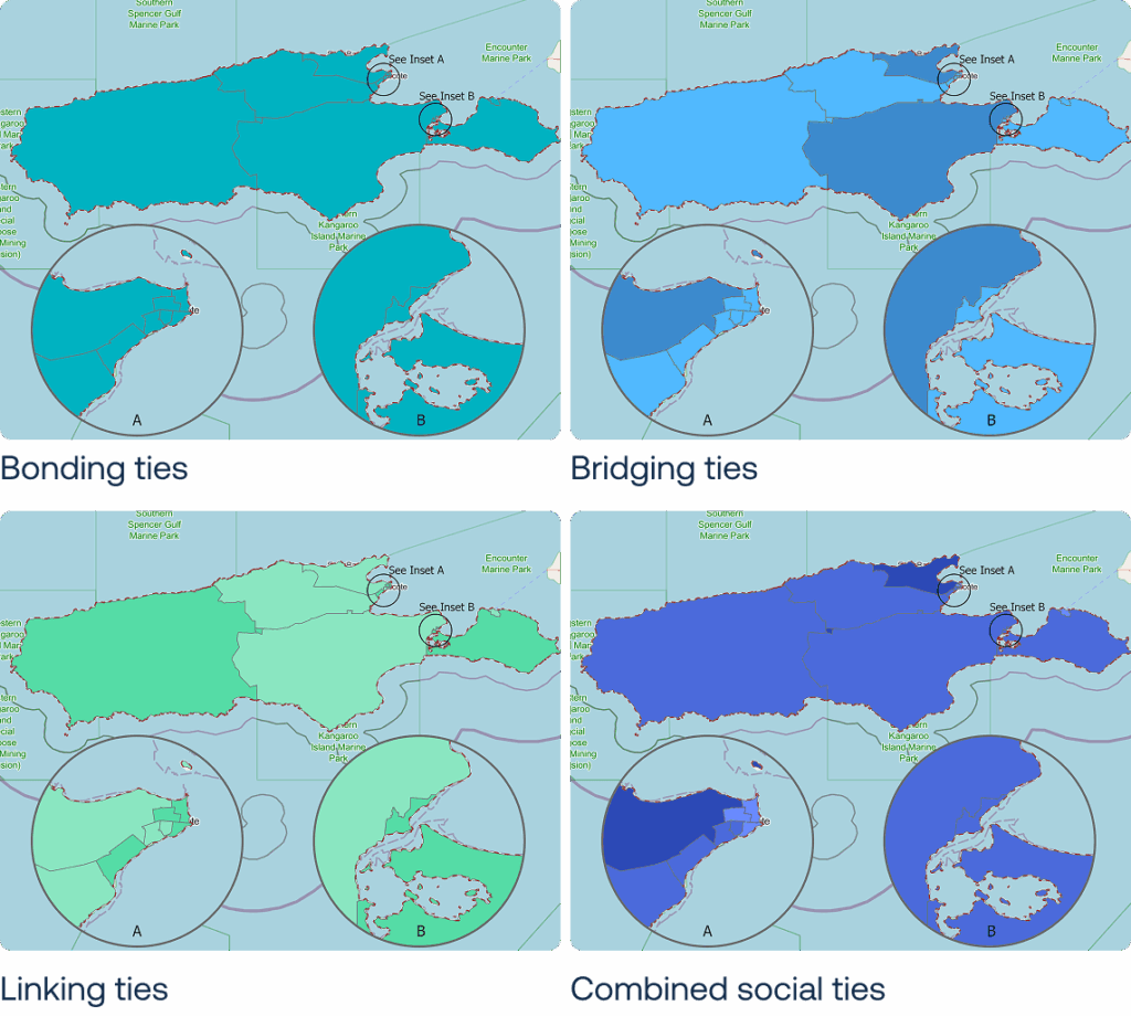 On Kangaroo Island, combined social tie levels range from medium to very high. Linking ties, however, range from low to medium.
