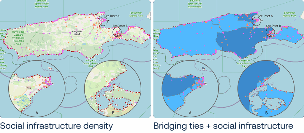 The findings show a clear correlation between higher density scores and stronger bridging ties. While most social infrastructure is concentrated in Kingscote, past disasters have shown the vital role that remote caravan parks play during emergencies.